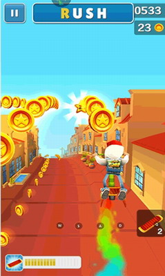 可以拾取到的有:火箭推进背包可以让角色飞一段距离并沿路收集一串金币;超级运动鞋可以让角色比正常情况下跑的更快;金币磁铁可以帮助自动收集角色附近一定范围内的所有金币;最后是双倍积分,一定时间内获得分数加倍。上述这些技能只能持续有限的时间,因此需要把握时机更好的利用它们。